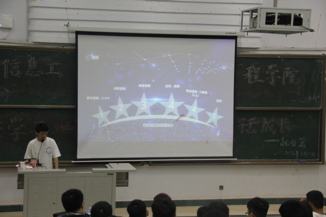 【就业篇】电信与通信专业开展“优秀学子话成长”系列活动电信与通信专业开展“优秀学子话成长”系列活动 为弘扬正能量,发挥榜样力量,也为进一步推动2020级学生就业指导工作,帮助学生提前了解就业形势,提升就业素质。我院于5月28日在正心楼01开展了“优秀学子话成长——就业篇”宣讲活动,2020级全体电信和通信专业的学生参加。 宣讲会上,19级刘宏斌同学总结了找工作的几点经验作为分享,第一点就是就业前期一定要准备好证件照、漂亮的简历、了解投简历的平台。第二点提前准备好面试发言,可以通过多家公司的面试来刷面试经验。第三点多加HR的微信,和HR保持联系,并打造自己活泼阳光的人设,让HR看到积极向上的一面。第四点找工作过程中会遇到很多受打击的事情,比如简历石沉大海,面试不通过等等,但同学们一定要相信自己,坚持下去,一定会找到适合自己的工作。