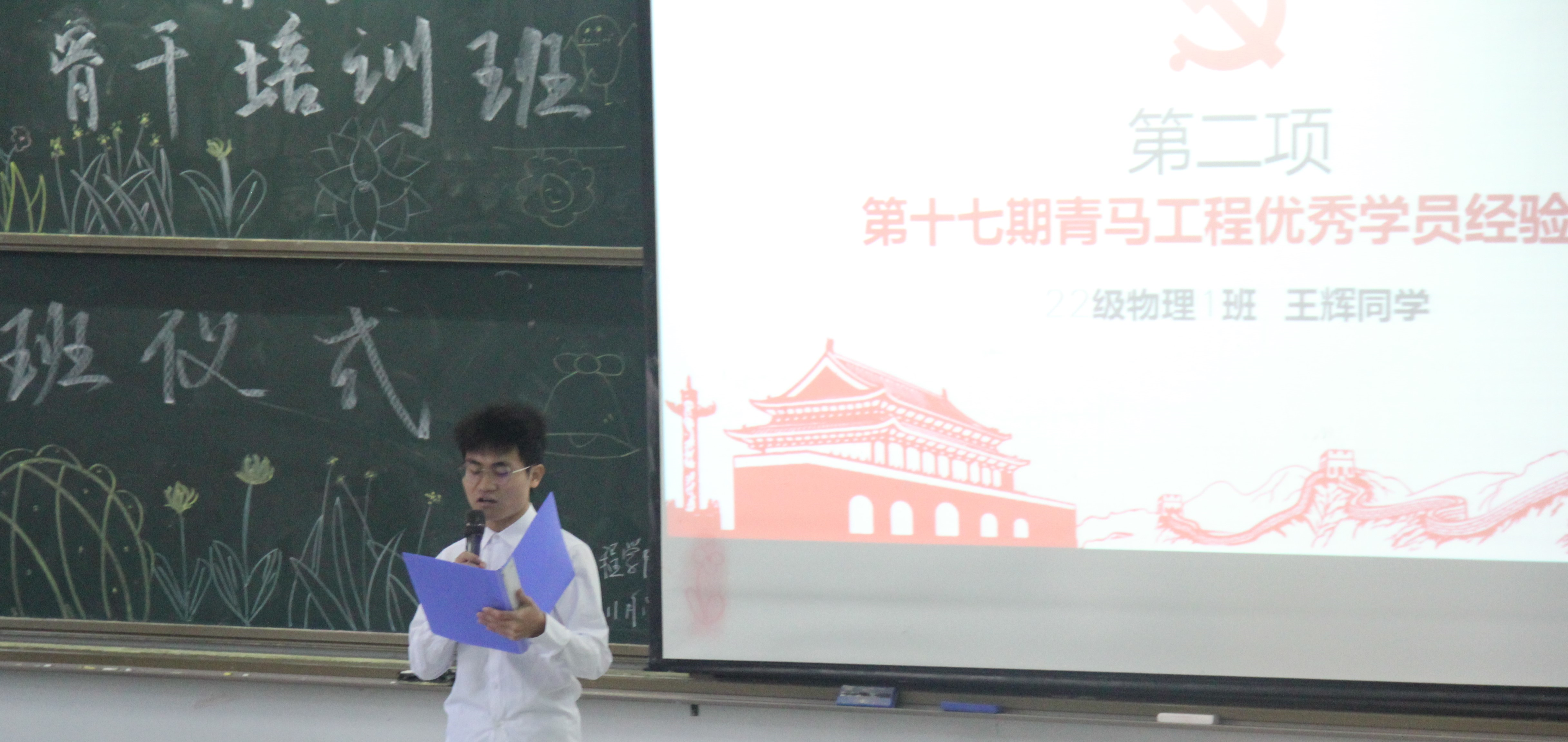 活动第一项,同学们齐唱团歌。 活动第二项,第十七期骨干培训优秀学员王辉进行经验分享。他讲述树立马克思主义理念、坚定马克思主义信仰、掌握科学方法论的重要性和作用,引导青年学子树立正确的人生观、价值观、世界观,同时鼓励同学们要勇于面对困难和挑战,不断学习进步。
