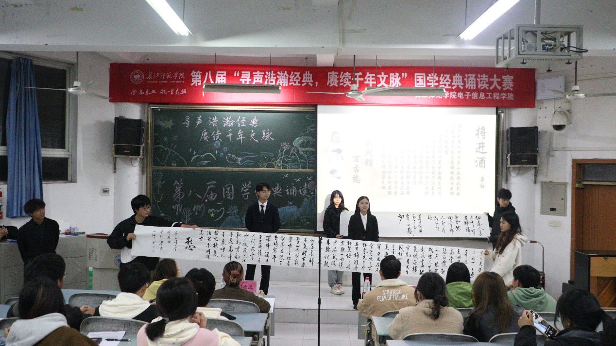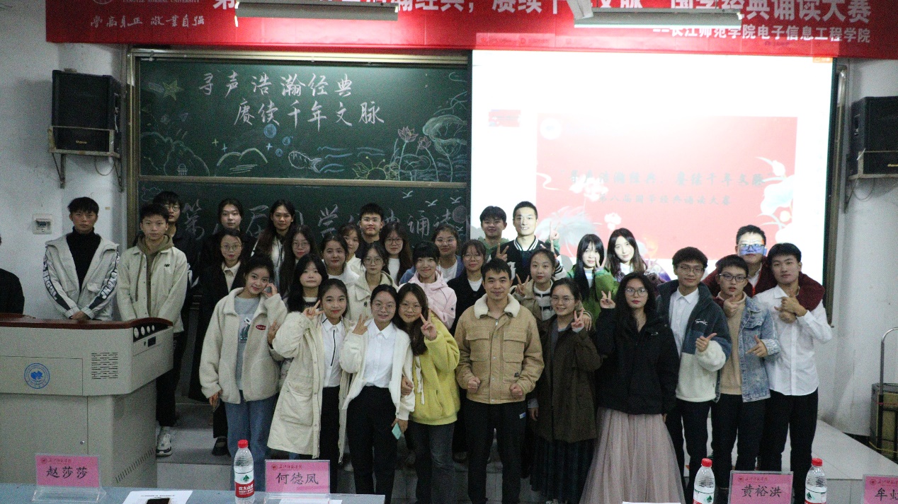 为激励青年学子在国学经典中学习千年智慧与哲思,做中华优秀文化的学习者、传承者。我院于11月13日19:00在格03阶梯教室举行电子信息工程学院第八届国学经典诵读大会。23级辅导员黄裕洪、执行主席何德凤、主席团成员赵莎莎、张俊毅担任本场比赛的评委。