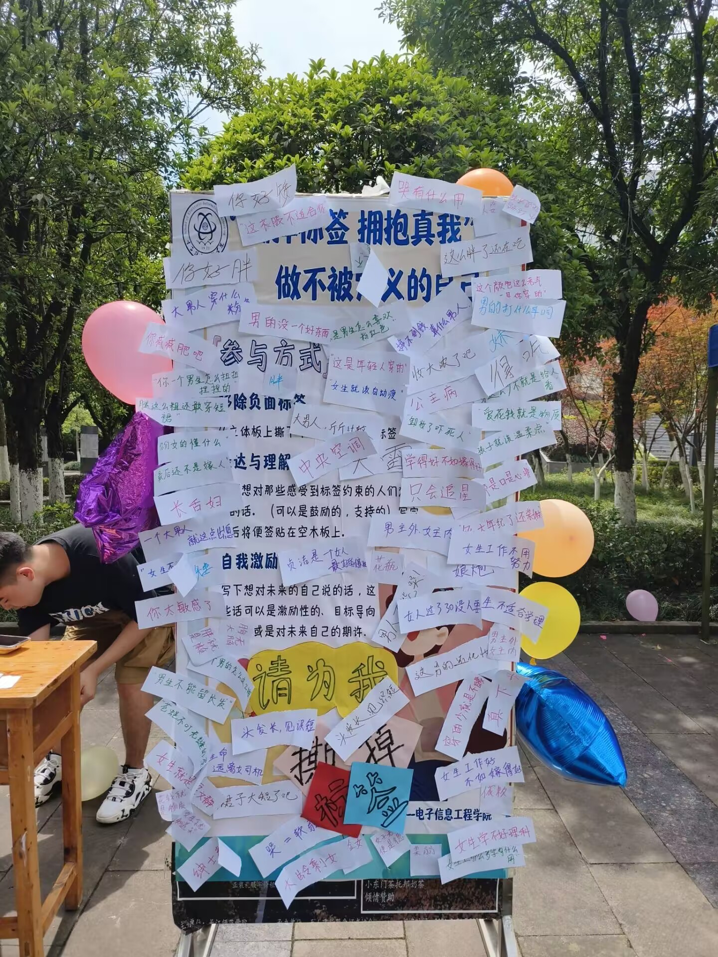 电信学院举办“撕掉标签,拥抱真我”心理活动电信学院举办“撕掉标签,拥抱真我”心理活动 2024年5月27日,电信学院在北苑音乐厅门口开展了第九届“我爱我”大学生心理健康节之“撕掉标签,拥抱真我”的心理活动,由电信学院心理发展部承办,全校师生参与。 活动伊始,我院以书面标签的形式,发泄一些在生活中积攒的负面情绪。也许是被误解,也许是被歧视,在这些没有直接反驳的瞬间,积攒下的情绪,在撕掉标签那一刻发泄出来,与自己的心达成真正的和解。