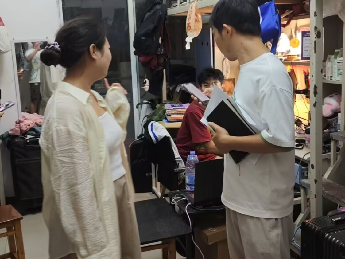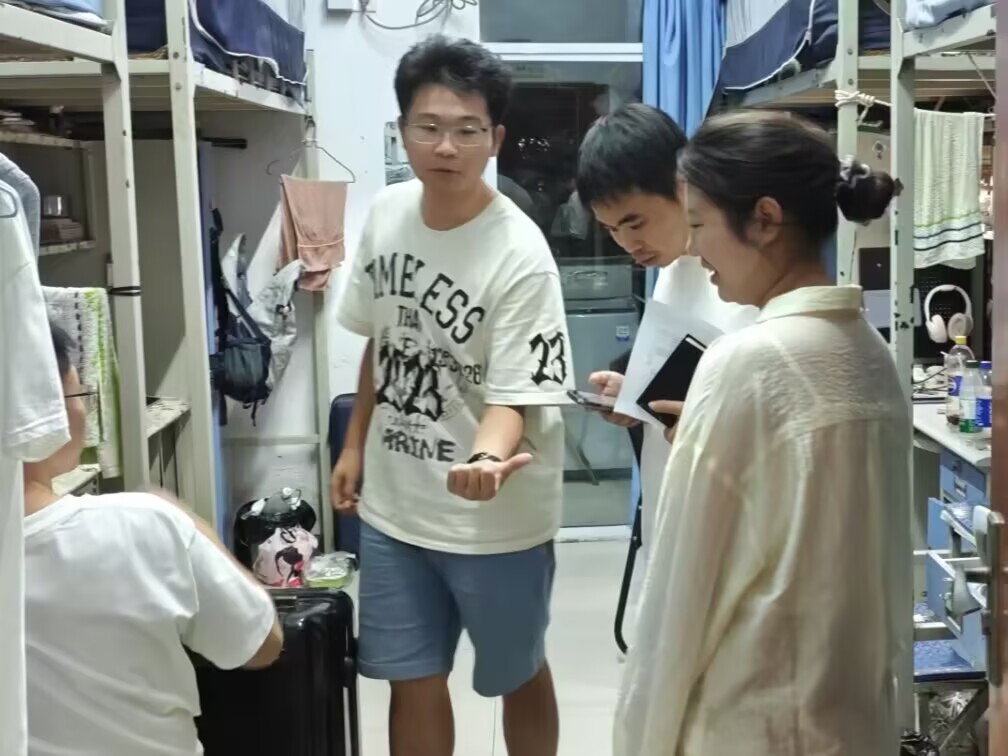 当晚,党委书记、全体辅导员、学生社区管理部工作人员20:00在南苑食堂门口集合,而后按照年级分三组同时进行。党委书记张敏与新生辅导员陈吕豪一起前往大一宿舍,张书记特别关照新生寝室,叮嘱其尽快安顿,不要使用大功率电器,人走断电,共同维护宿舍的安全稳定,展现大学生的文明形象。 黄裕洪老师与陈玲老师组队深入大二学生宿舍,邓志平老师、孙德仙老师与罗月老师深入大三学生宿舍,郑晓春老师则深入大四学生宿舍。老师们强调近期是审核评估的预评估阶段,尽管刚刚开学,也要强化主人翁意识,共同为学校的发展贡献自己的力量。