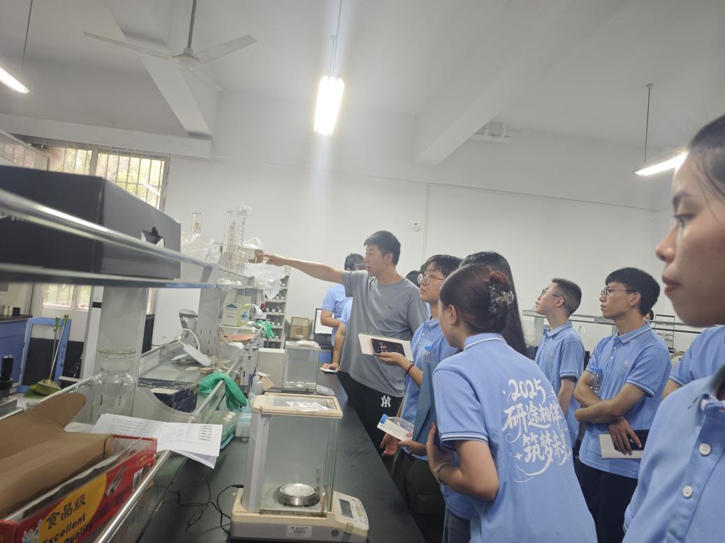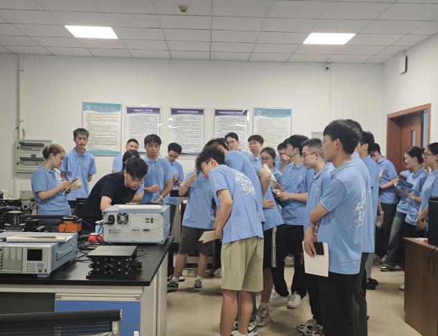 2025级研究生新生在校园地标前的第一张“全家福” 活动的最后一程回到学院内部。在1110实验室,赵文喜老师热情地展示了他的研究方向与实验室设备。学院党政办公室,郑晓春老师向大家介绍了办公室职能,方便未来办理各项事务。五楼电子竞赛基地,甘德成老师介绍了基地辉煌的竞赛历史,展示了往届获奖作品,引起了在场同学的阵阵赞叹。六楼物理学展室,葛泽玲老师的讲解,带领大家进行了一场物理学的时空穿梭,感受了学科的基础与魅力。