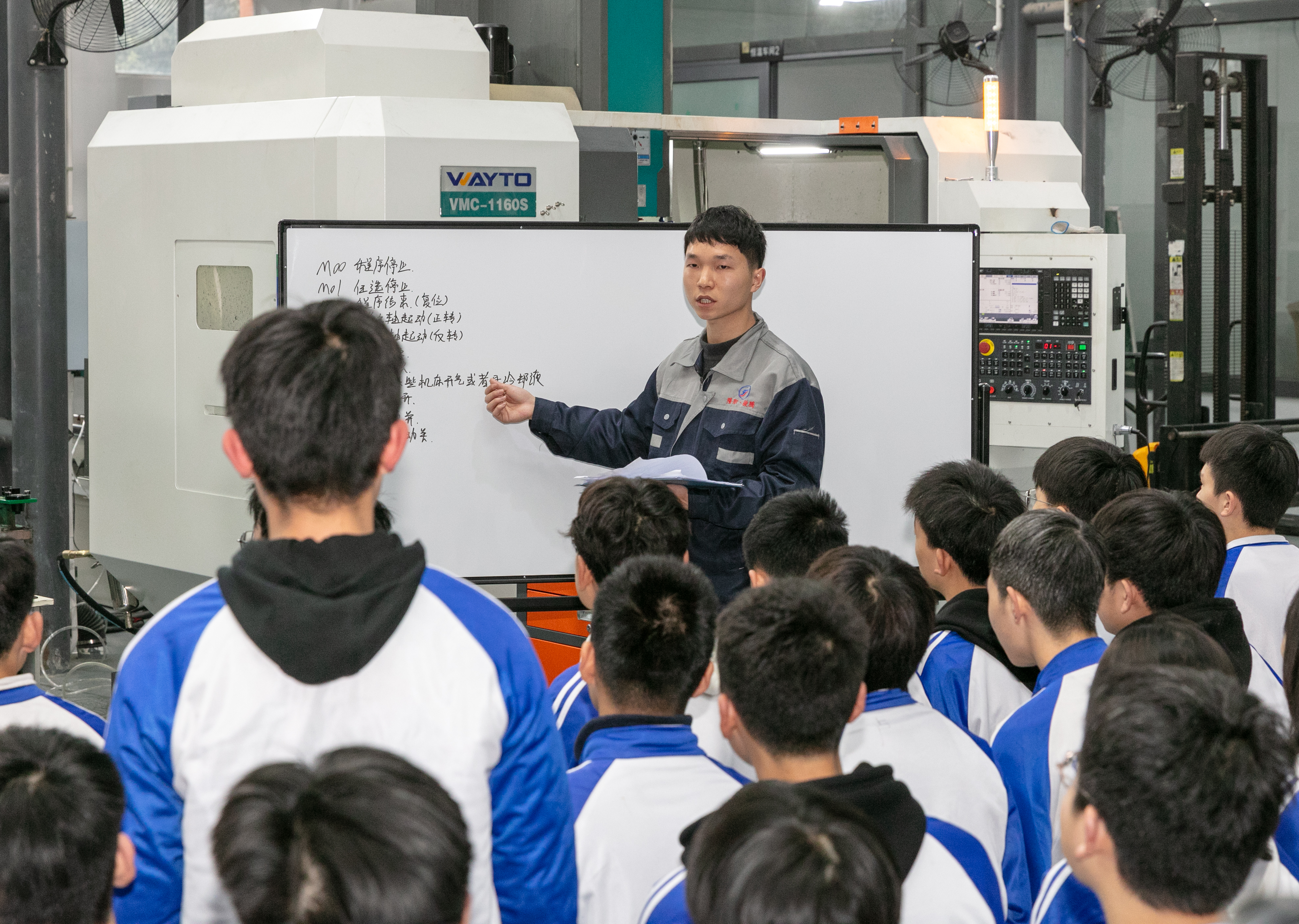 图3 隆化职中校企合作企业技术人员承担实训教学指导任务 于是,张健开始了大胆的探索和实践。他坚持产教融合、校企合作的高素质技能人才培养路径,首创“三权分置”共建生产性实训基地校企合作模式。他采用“招募式”引企入校机制,与远陆汽修、柏曼酒店等多家企业共建校内生产性实训基地,构建“前校后厂”办学格局。这一举措不仅为学生提供了更多的实践机会,也为企业量身定制了实用人才。