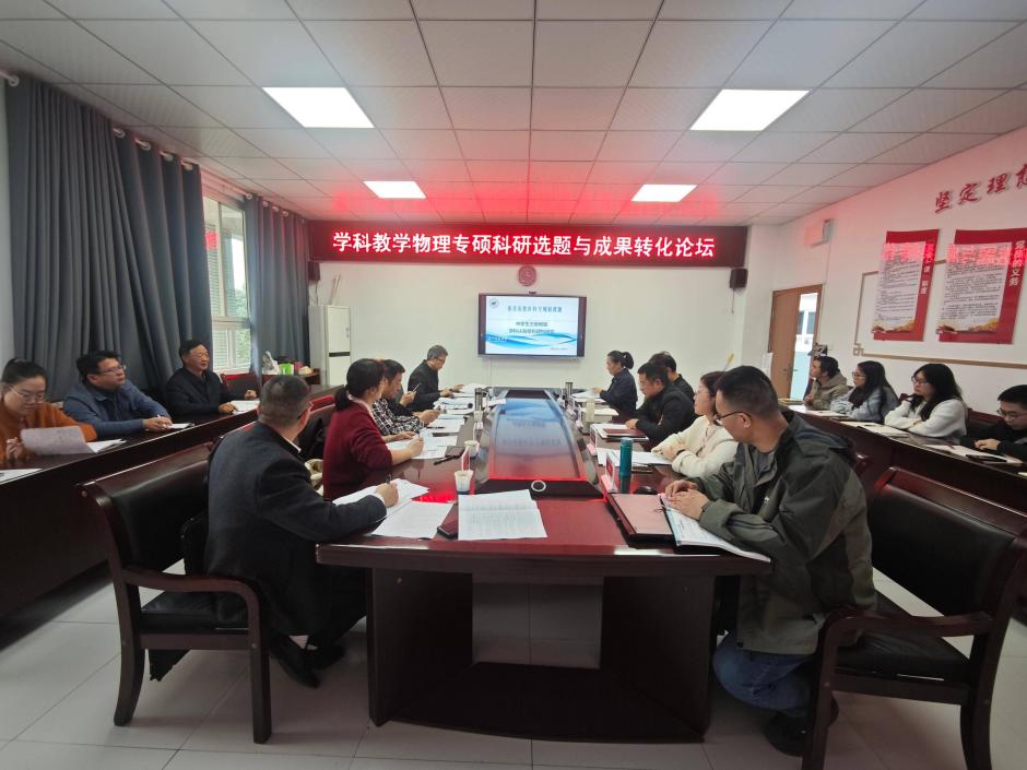 会议伊始,谢正发书记介绍了专家及会议背景,强调本次开题答辩对推动教育科研与教学实践融合的重要意义。之后,三项市教育科学规划项目依次进行汇报。汇报结束后,专家组围绕研究目标、方法创新性及实践可行性展开提问,并形成合议意见,为项目后续推进提供了方向指引。 之后开展了“破解中学物理教学痛点—学科教学物理专硕的科研选题与成果转化”主题研讨。专家与师生围绕“如何立足教学实践提炼科研问题”“专硕成果转化的现实路径”等议题展开深入交流。周智良副所长指出,物理专硕的科研应紧扣中学教学需求,避免“纸上谈兵”;黄全安主任结合一线教学经验,建议加强“教学问题-科研选题-课堂应用”的闭环设计。研究生导师与学生代表也分享了科研选题中的实践心得,现场气氛热烈。