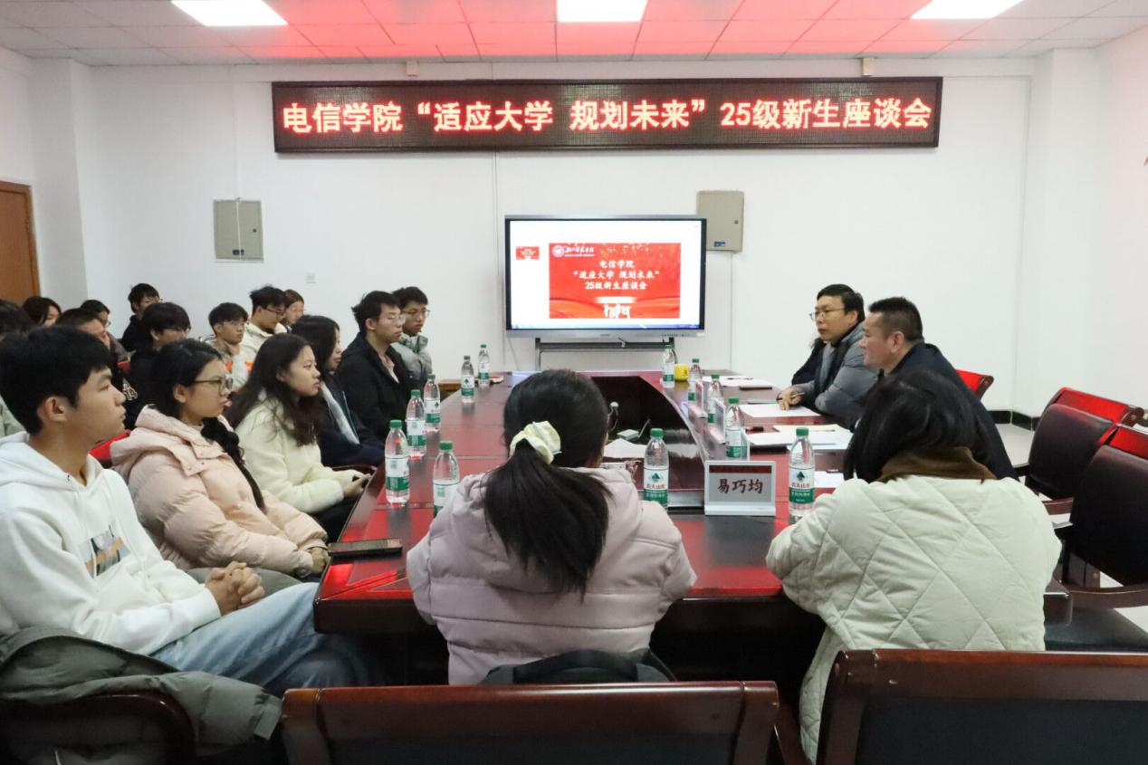 11月20日格物楼1210会议室里气氛热烈,电信学院2025级新生座谈会在此顺利举行。党委副书记肖恒、通信工程系主任杜得荣、物理系主任葛泽玲、班导师代表易巧钧和孙德仙老师,以及各班班长、团支书、学习委员和团学主要干部齐聚一堂。25级辅导员谭洲敏主持会议。