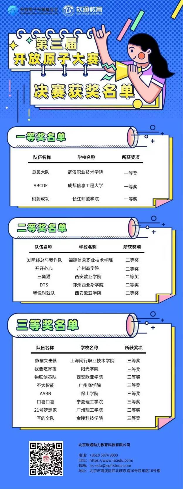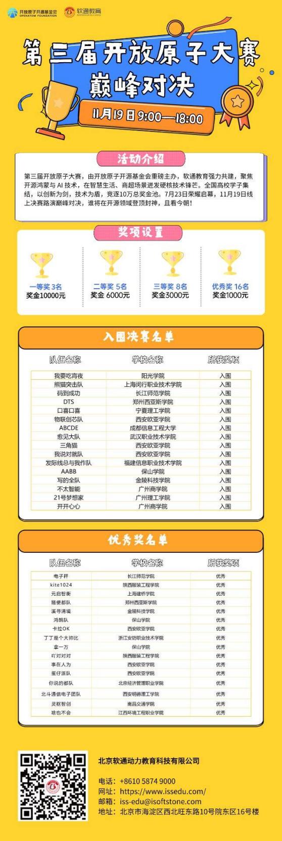 2025年11月19日,第三届开放原子大赛——基于开源鸿蒙操作系统的智慧生活应用创新赛决赛在北京拉开序幕。本次大赛吸引了来自全国各地的369支队伍踊跃报名,竞争异常激烈。我院鸿蒙微专业学生组成的参赛团队凭借扎实的专业知识、精湛的技术水平和出色的团队协作,在众多参赛队伍中崭露头角。其中,由鸿蒙班秦睿立和李欣忆同学组成的“码到成功”队凭借创新性的项目设计和出色的现场展示,一举夺得全国一等奖,并获10000元奖金;鸿蒙班陈鹏机团队荣获优秀奖及1000元奖金。这一成绩的取得,是我院鸿蒙微专业开班以来该教学团队继去年获得全国三等奖之后的又一重大突破,充分彰显了我院在鸿蒙领域的教学实力和学生的培养水平。
