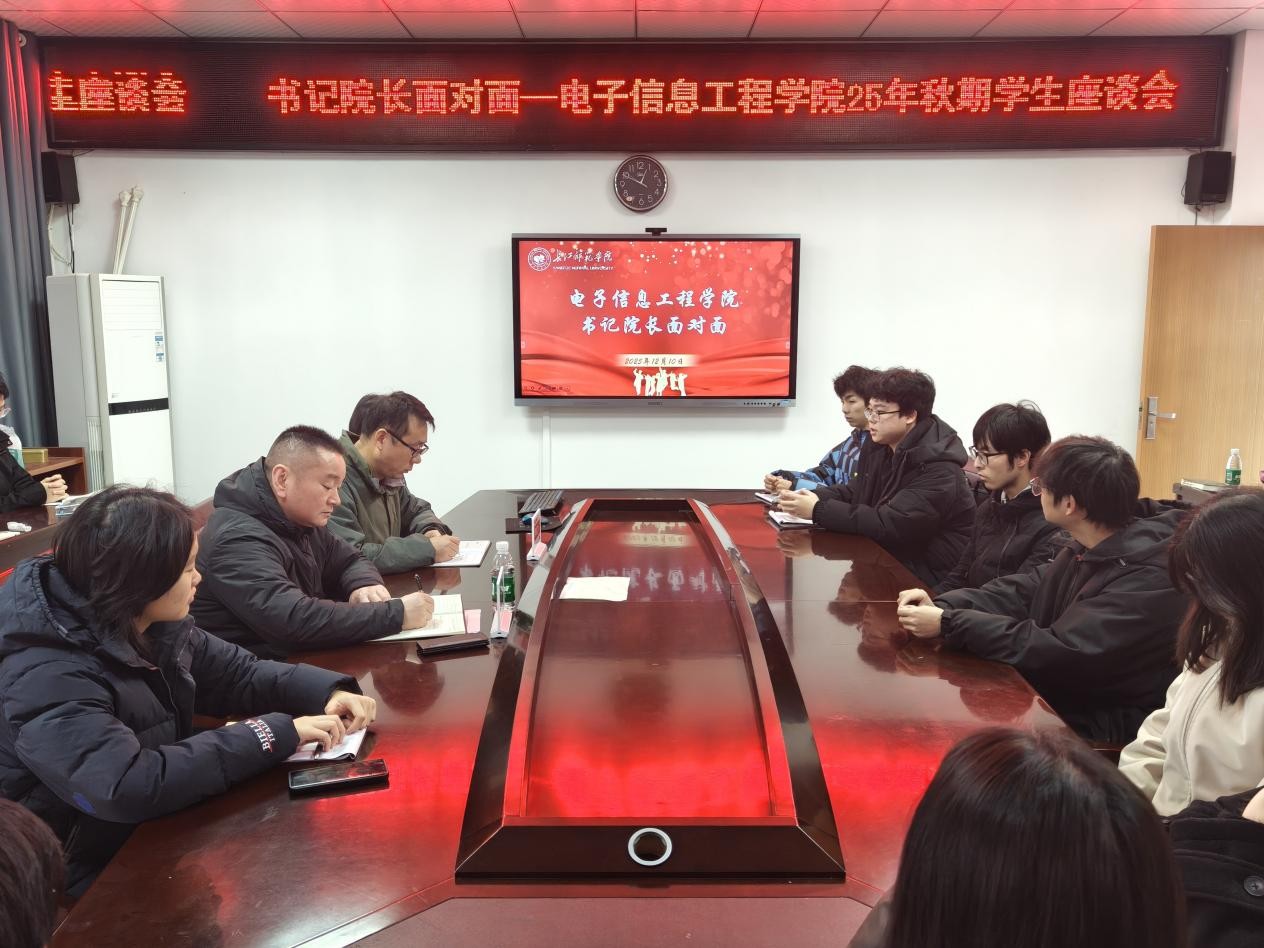 倾听学子心声,优化学习环境 ——电信学院召开25年秋期学生座谈会为精准掌握学生诉求,持续优化育人环境,12月10日,电信学院于格物楼召开2025年秋期学生座谈会。党委副书记肖恒、副院长郭红力、团委书记罗月与各年级学委代表齐聚一堂,共话成长。会议由郭红力副院长主持。