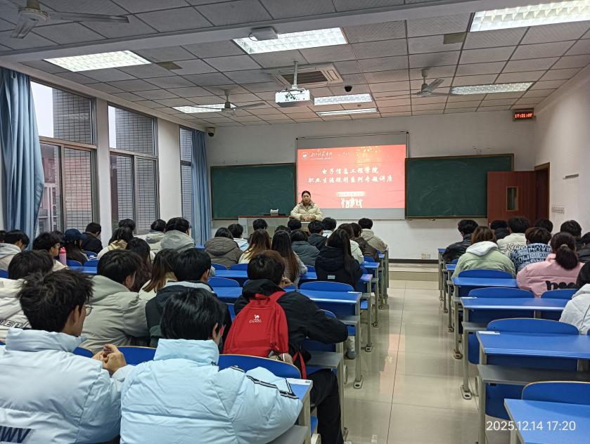 12月14日下午17:20,电子信息工程学院面向全体大二物理师范生举办职业生涯规划专题讲座,此次讲座由辅导员杨倩主讲。