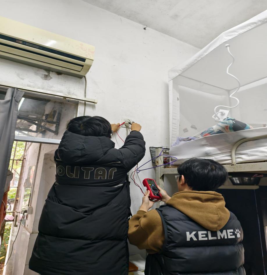 科普结束后,专业学子组成的“安全诊疗小队”手持万用表等仪表,带着精心整理的《寝室安全用电指南》,为报名寝室进行公益“电路健康检查”。重点排查私拉乱接、插座老化绝缘层破损、电路过载等隐患,针对发现的问题,小队从专业角度给出中立整改建议,同时耐心解答大家在日常用电中遇到的疑惑。通过教育引导方式帮助同学们理解电路原理,重视用电安全,提升安全用电自觉性。