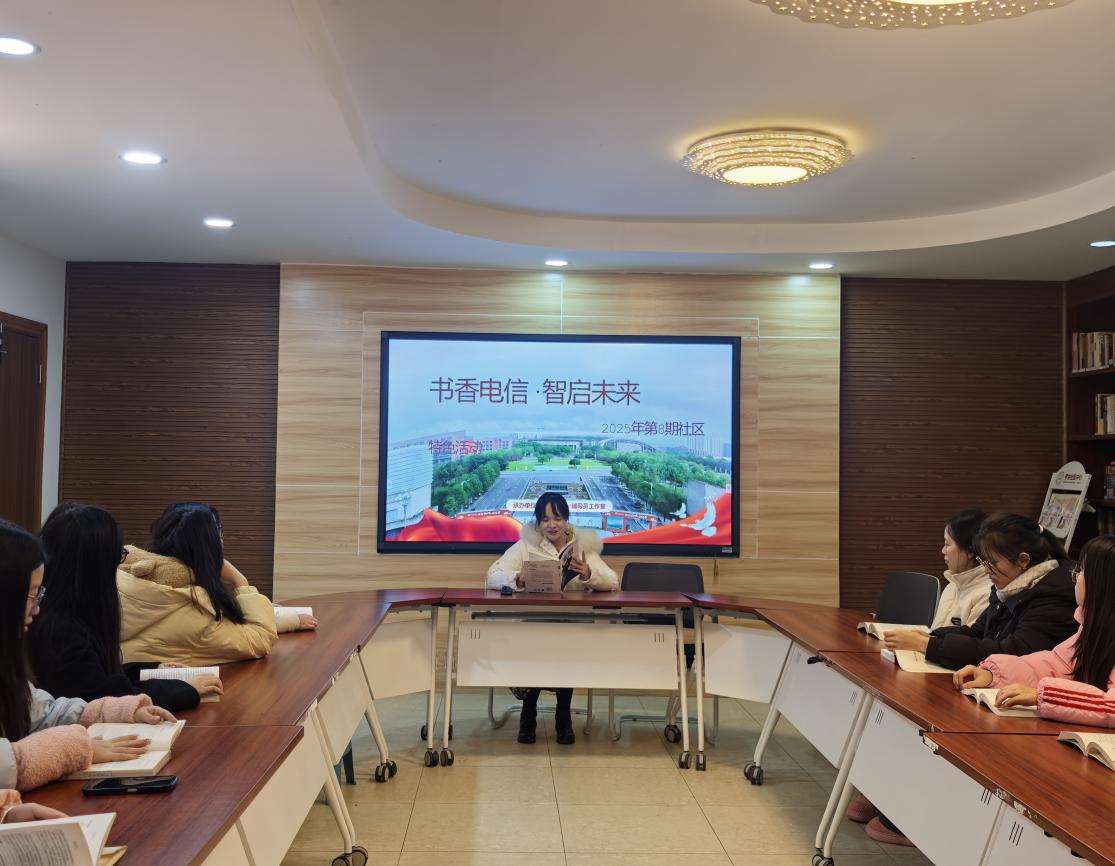 电信学院“书香电信,智启未来”第8期读书活动顺利开展为进一步厚植学生社区书香底蕴,丰富学子课余文化生活,引导青年学生在深度阅读中启迪智慧、涵养心灵,12月21日,由电信学院主办、知行领航辅导员工作室承办的品牌特色活动“书香电信,智启未来”第8期读书分享会在南苑学生社区温馨开讲。本次活动由电信学院辅导员、知行领航辅导员工作室主持人罗月老师倾情主讲,带领现场数十名同学沉浸式品读心理学经典书目《被讨厌的勇气》,共赴一场心灵成长之约。