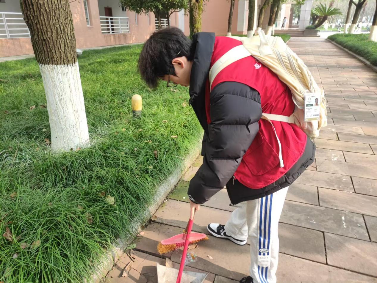 活动伊始,志愿者们于图书馆门前广场集结,负责人详解活动流程、区域划分及安全须知,并发放工具。随后,志愿者们奔赴图书馆周边绿化带、人行道、休闲长椅等重点区域,迅速投身清洁工作。寒风凛冽的冬日里,志愿者们热情不减。面对绿化带深处卫生死角,他们或蹲或跪细致排查,不漏一处隐患。阳光映照下,红马甲与绿植相映成趣,成为校园活力风景线,过往师生纷纷赞许,不少同学主动加入,共赴环保之约。历经一个半小时劳作,图书馆周边环境焕然一新。志愿者们望着成果满脸自豪。