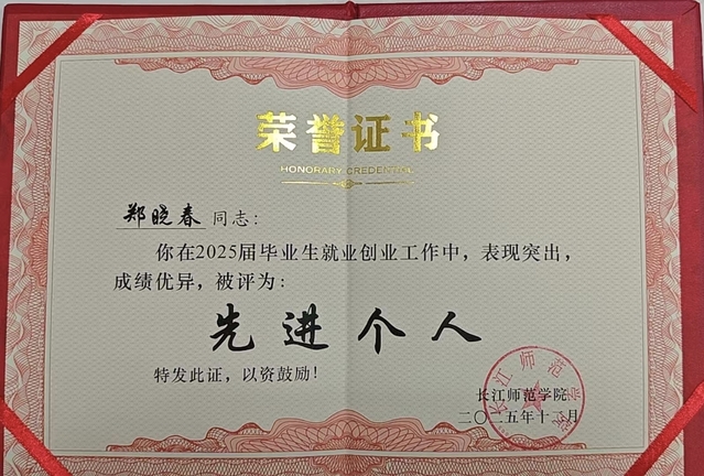 喜讯!我院荣膺2025届就业创业工作先进集体和先进个人称号近日,从学校招就处获悉,我院在2025届毕业生就业创业工作中成效显著,荣获“2025届就业创业工作先进集体”称号,郑晓春老师被评为“先进个人”。