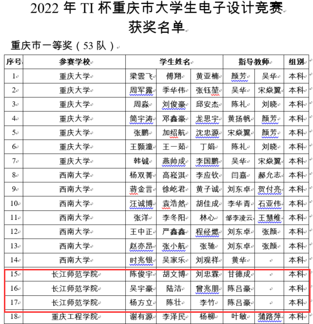 电信学子在2022年TI杯重庆市大学生电子设计竞赛中创下佳绩 近日,由重庆市教委主办的2022年TI杯全国大学生电子设计竞赛落下帷幕(单年国赛,双年省赛),该赛事是电子专业的最高级别的赛事。由重庆大学、重庆邮电大学、西南大学、重庆邮电大学、重庆交通大学、重庆理工大学等558个队报名参赛。由全国大学生电子设计竞赛专家组命题,7月27-30日四天三夜的激烈竞赛,我院共有15支队伍报名参赛,经过线上初评,专家复测,重庆市教委公示,最终我院斩获重庆市一等奖3项,二等奖5项,三等奖2项。在兄弟院院名列前茅,取得我院该项赛事以来的最好成绩。我校被评为优秀组织单位,甘德成、陈吕豪老师被评为赛区优秀指导教师。本次参赛的成功,体现了电子信息工程学院“以赛促教、以赛促学”提升学生的专业水平、协作精神及创新能力的新工科建设成果。